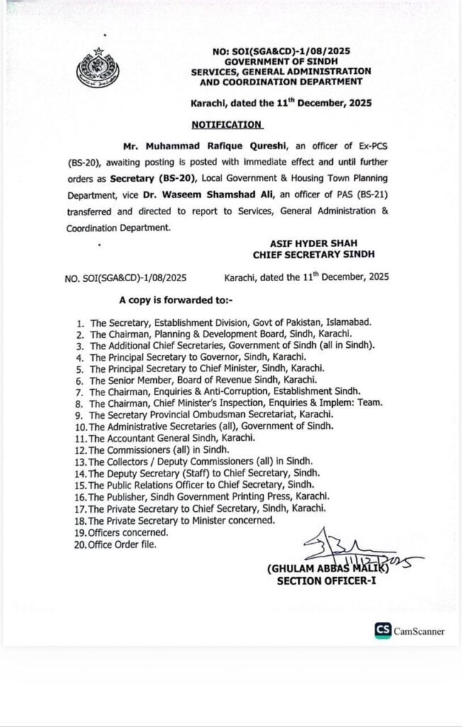 کراچی : محکمہ بلدیات سندھ میں اہم انتظامی تبدیلی کر دی گئی ہے ۔ ایڈیشنل چیف سیکریٹری بلدیات ڈاکٹر وسیم شمشاد کا تبادلہ کر دیا گیا ہے اور ان کی جگہ گریڈ 20 کے سینئر ایکس پی سی ایس افسر رفیق قریشی کی تقرری کا نوٹیفکیشن جاری ہو گیا ہے۔