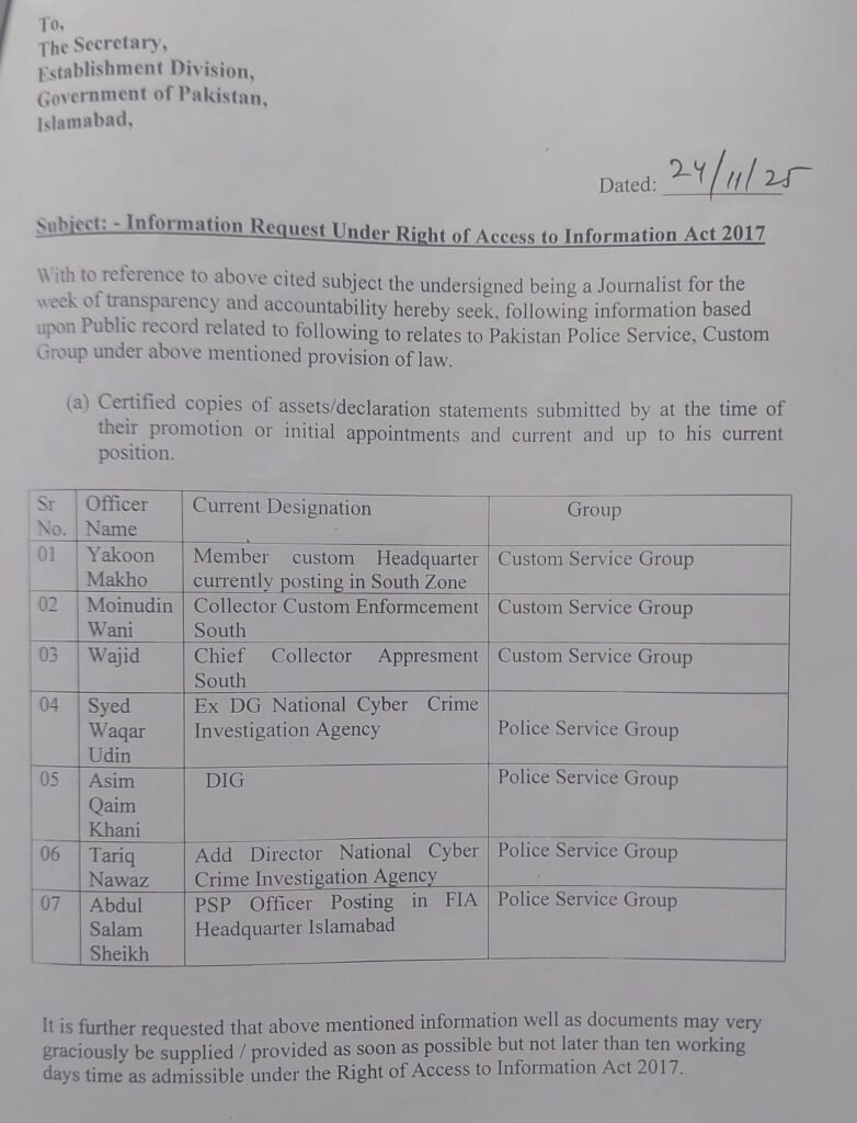 اس حوالے سے تحقیقات ڈاٹ کام نے 24 نومبر 2025 کو سیکرٹری اسٹیبلشمنٹ ڈویژن کو خط تحریر کیا تھا ۔ جس میں رائٹ ٹو انفارمیشن ایکٹ 2017 کی سیکشن 19A کے مطابق پاکستان کسٹمز سروسز سے منسلک ممبران جن میں ممبر کسٹم پیڈ کوارٹر (ساوتھ زون) یعقوب ماکو ، چیف کلکٹر کسٹمز ساؤتھ اپریزمنٹ واجد علی ، کلکٹر کسٹمز انفورسمنٹ ساؤتھ معین الدین وانی اور پولیس سروسز گروپ سے وابستہ افسران سابق ڈی جی نیشنل سائبر کرائم انوسٹی گیشن ایجنسی وقار الدین سید ، ڈی آئی جی عاصم قائم خانی ، ایف آئی اے ہیڈ کوارٹر میں تعینات عبدالسلام شیخ کے علاوہ موجودہ ایڈیشنل ڈائریکٹر نیشنل سائبر کرائم انویسٹی کے علاوہ گیشن ایجنسی کراچی طارق نواز کے اثاثوں کی مکمل تفصیلات، سرکاری تعیناتی کے دوران جمع کرائے جانے والے گوشوارے اور ہر افسر کے مختلف عہدوں پر تقرری کے عرصے کی مکمل معلومات طلب کی گئی تھیں ۔